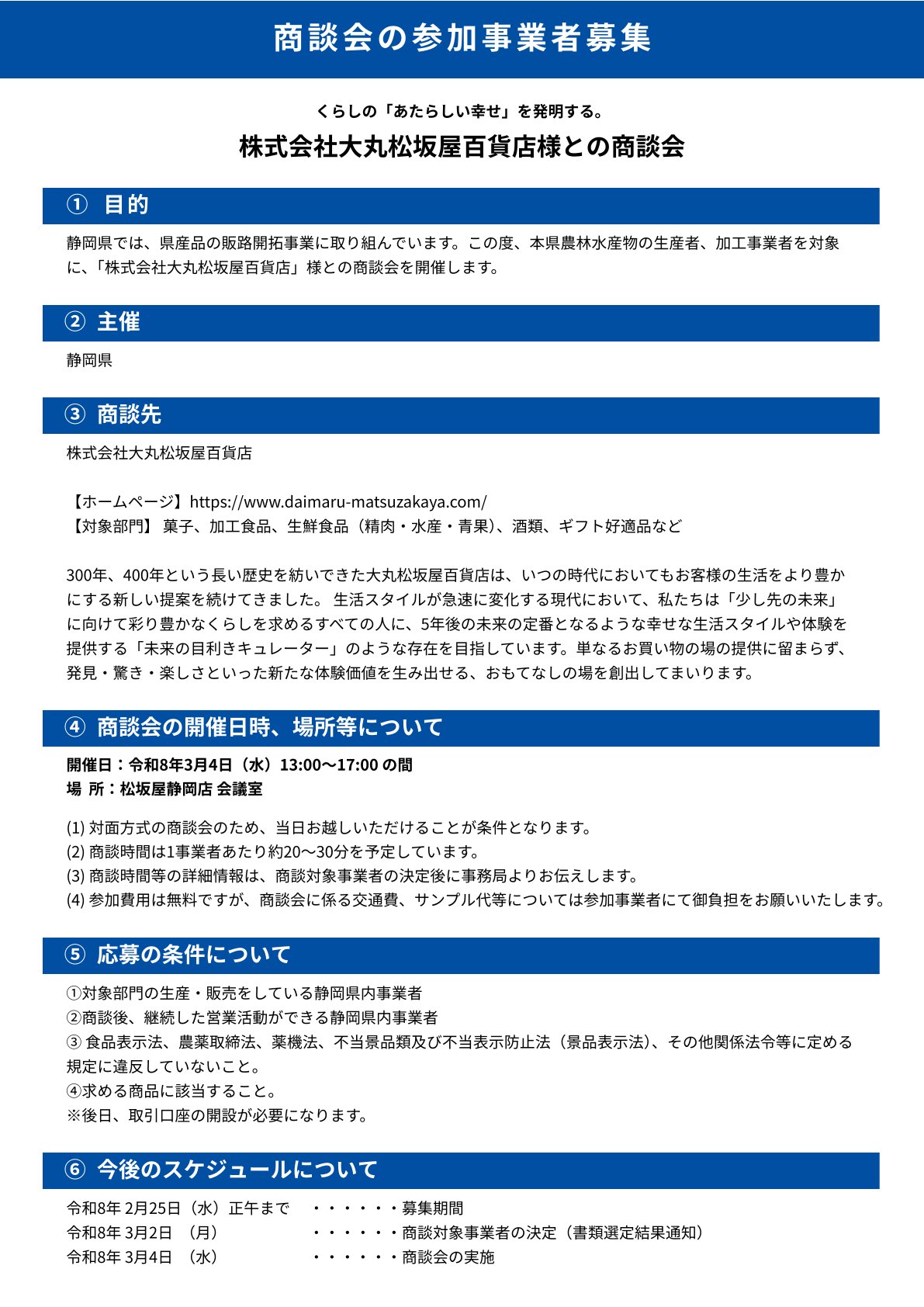 この度、本県農林水産物の生産者、加工事業者を対象に、(株)大丸松坂屋百貨店様との商談会を令和8年3月4日(水)に開催します。