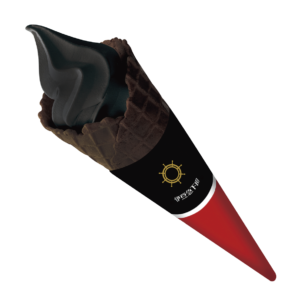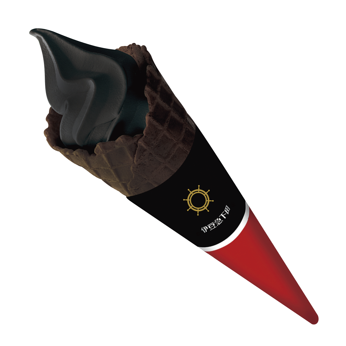 開国の地下田に来航した黒船と、伊豆急行線を走る黒船電車をイメージした真っ黒なソフトクリーム。チョコベースに竹炭の微粉末を混ぜ込んだ黒にこだわった逸品。下田駅だけの限定販売です。どうぞご賞味あれ。価格500円